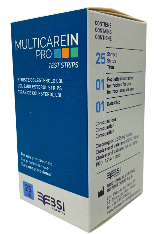 Tiras reactivas para el test cuantitativo de colesterol LDL en la sangre, estas tiras se utilizan exclusivamente con el equipo MULTICARE-IN PRO. (No validas con el medidor MULTICARE IN)
